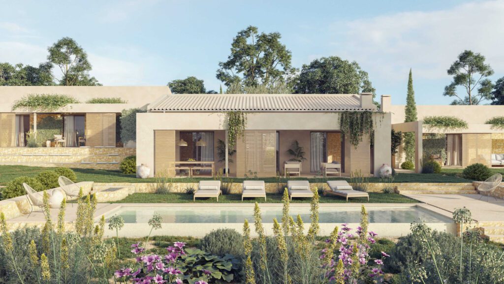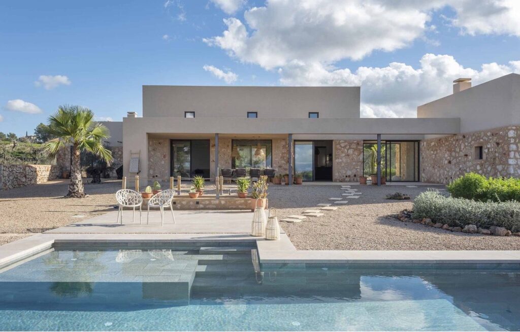 Una finca de estética esencial, en la que se ha trabajado intensamente la orientación y la compacidad volumétrica para reducir la demanda energética al mínimo. La vivienda se entierra parcialmente, aprovechando la inercia térmica del terreno, y se protege con muros de piedra tradicional reinterpretados con soluciones técnicas de última generación. Son Rullan es la prueba de que lo rural también puede ser sofisticado y eficiente.