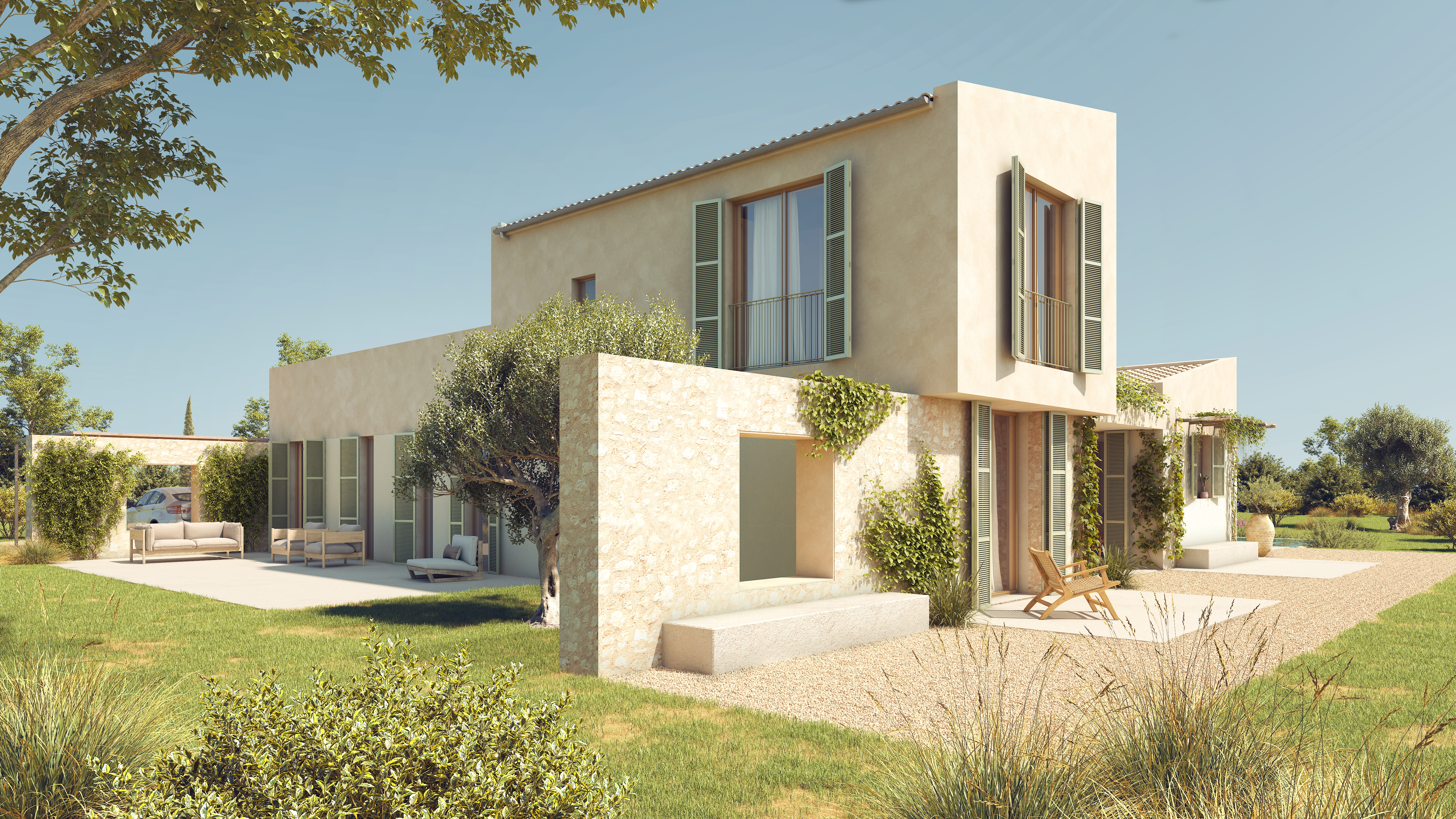 Este proyecto de vivienda unifamiliar con piscina refleja el estilo de vida mediterráneo, combinando diseño, funcionalidad y respeto por el entorno natural. Situada en un terreno del Raiguer con vistas a la bahía de Alcudia y la Serra de Tramuntana, la casa utiliza materiales locales, como piedra mallorquina, y acabados en tonos tierra para integrarse con el paisaje. Su diseño se organiza en dos volúmenes principales de cubierta inclinada, conectados por espacios de transición que enmarcan patios y terrazas. Los interiores, abiertos y luminosos, se conectan con el exterior, integrando piscina y jardín. La propuesta prioriza sostenibilidad, confort y armonía visual.