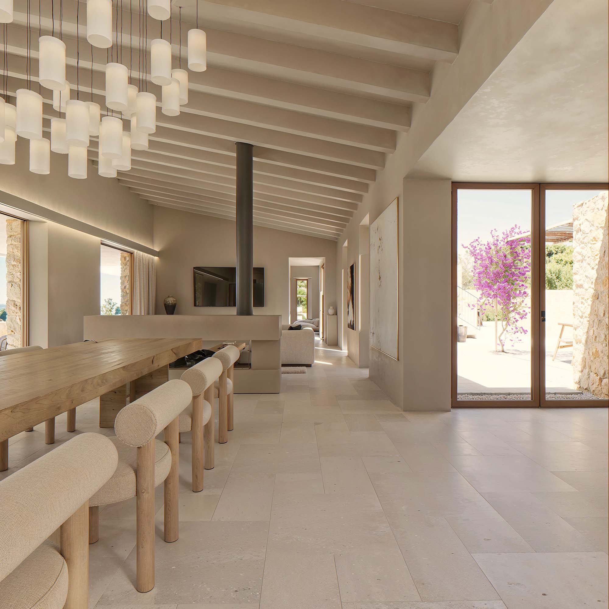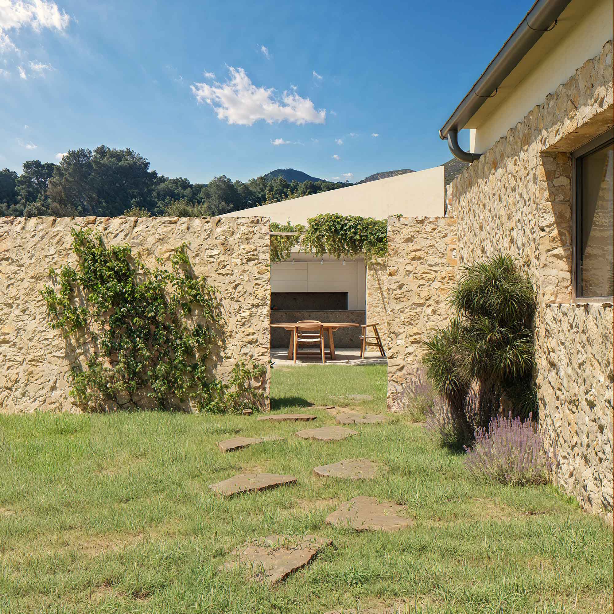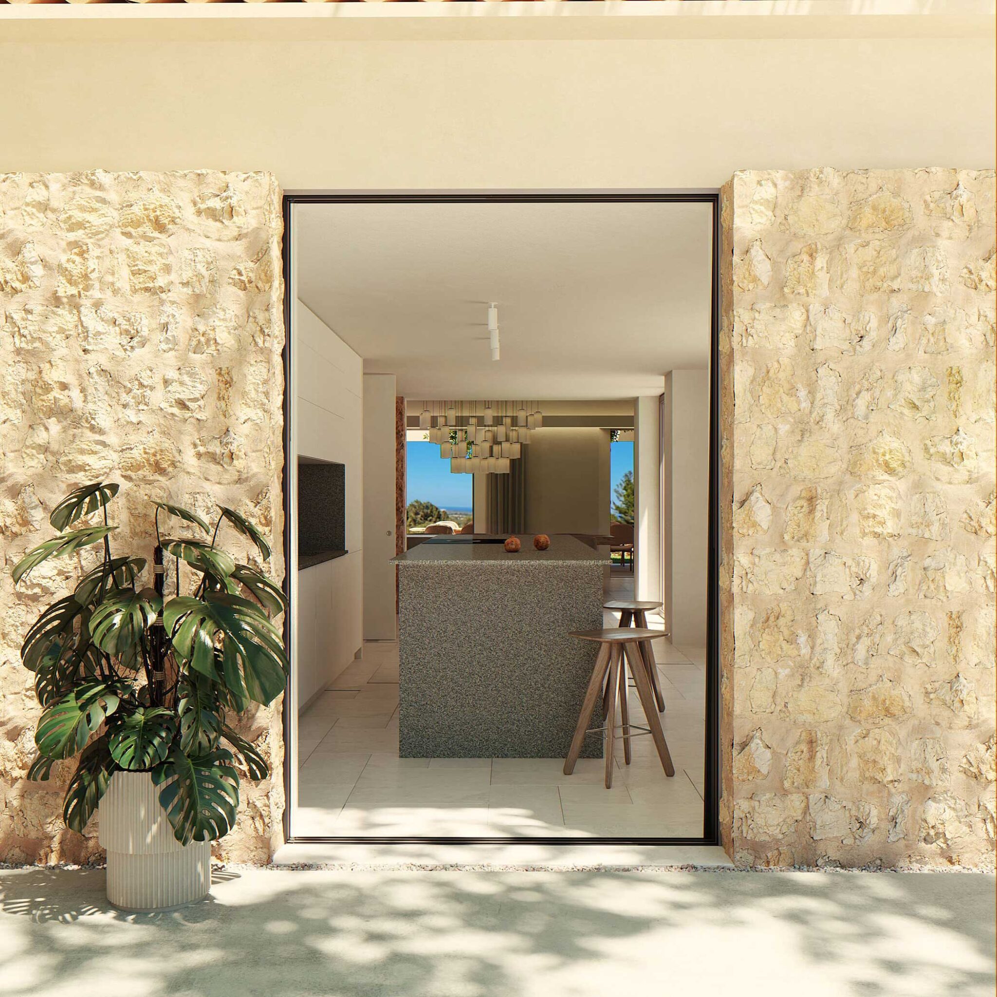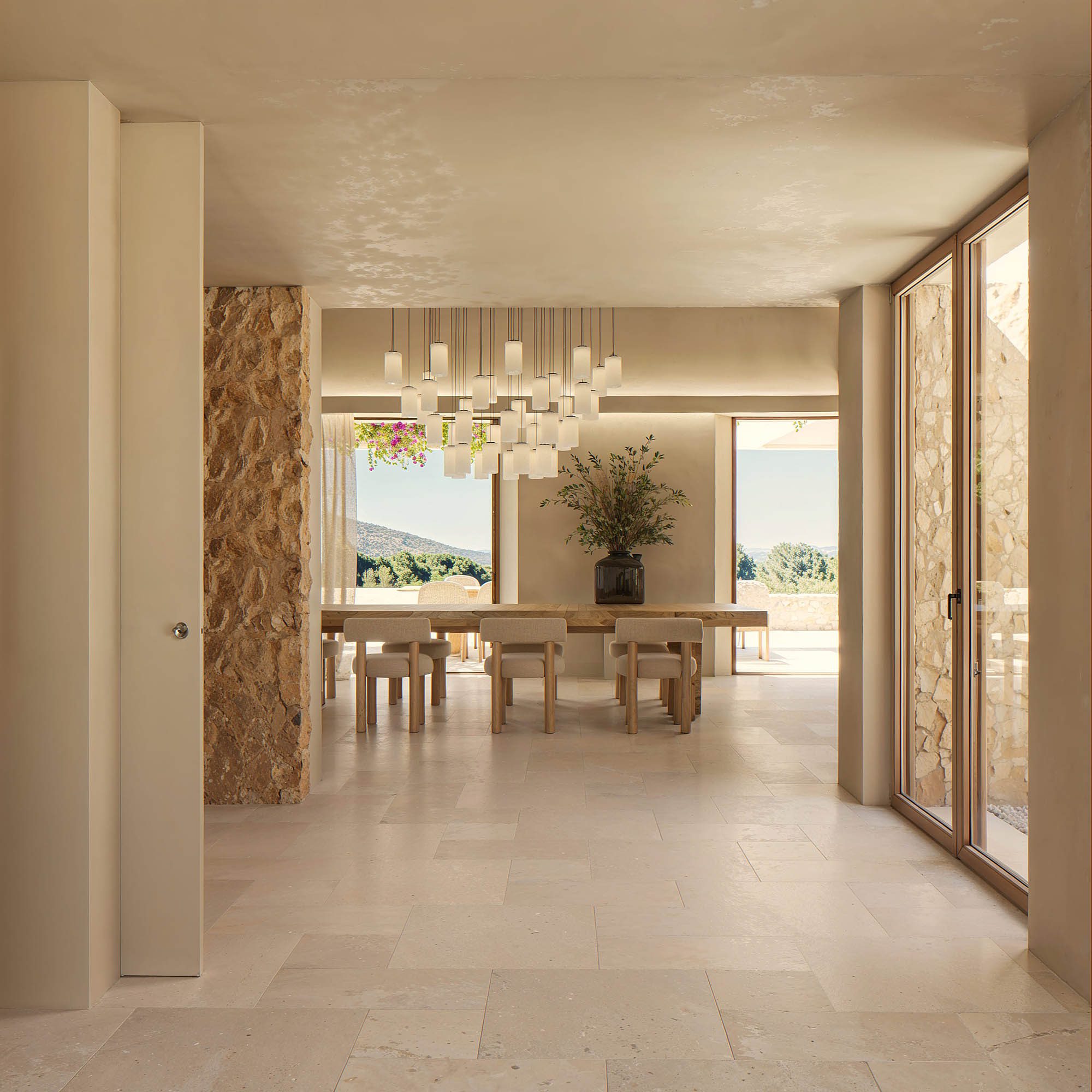 Los materiales naturales, como la piedra local y la madera, aportan una calidez única, mientras que los grandes ventanales y terrazas permiten disfrutar de la luz mediterránea y de las vistas al paisaje. Los patios y zonas exteriores están diseñados como extensiones del hogar, ideales para momentos de relax, reuniones familiares o simplemente para conectar con la serenidad del entorno. Cada detalle de la casa invita a vivir de manera tranquila y en armonía con la naturaleza que la rodea.
