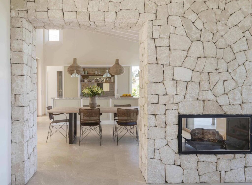 - El uso racional de materiales: revestimientos exteriores en piedra local “verda”, interiores unificados con yeso de cal y pavimentos continuos de cemento